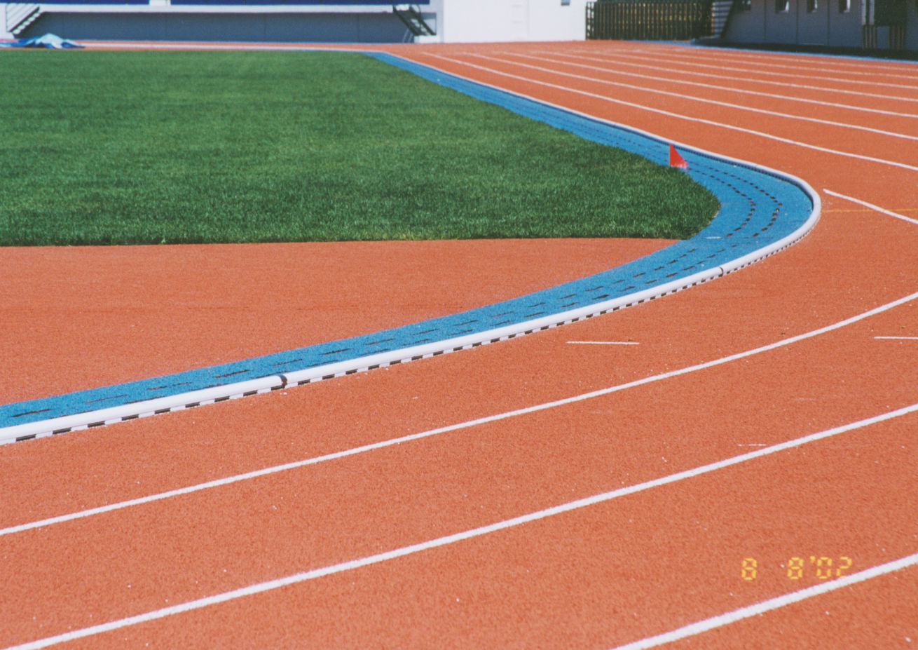 國際田聯(lián)田徑場地設(shè)施標準手冊規(guī)定標準的塑膠跑道內(nèi)圈周長400米,其中彎道半徑應(yīng)為36.5米,直道要沿南北方向避免太陽位置低時的炫目影響。彎道應(yīng)有8條跑道,每條跑道寬為1.22米,直道有10條跑道。跑道內(nèi)側(cè)安全區(qū)域不少于1米,外側(cè)最好也有1米的安全區(qū),起跑區(qū)最少3米,沖刺緩沖段至少17米。跑道左右傾斜度最大不得超過1:1000,跑的方向上的向下傾斜度不得超過1:1000。