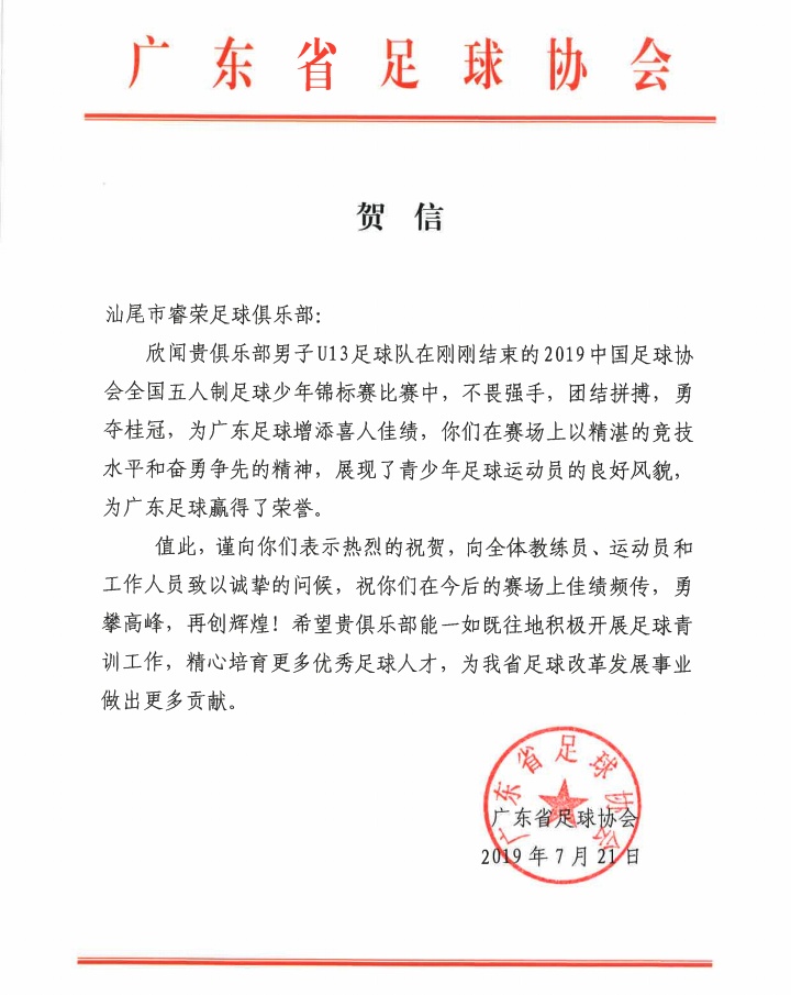 廣東省足球協(xié)會(huì)分別向汕尾市文化廣電旅游體育局、睿榮足球俱樂部發(fā)賀信。