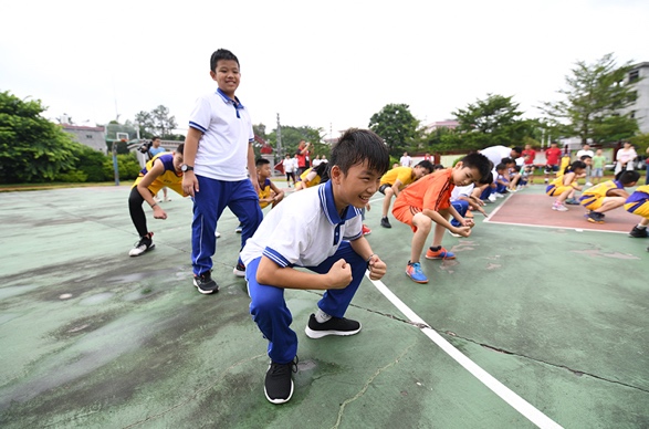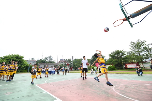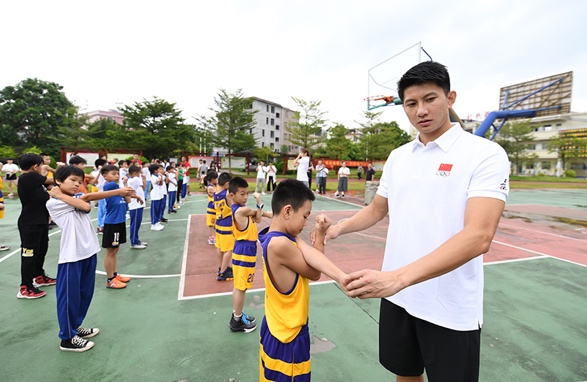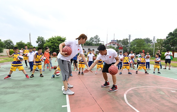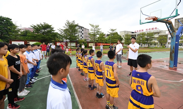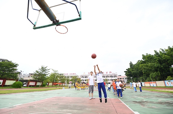 隨后,支教課程進(jìn)入到有球環(huán)節(jié)。從最基礎(chǔ)的原地運球,再到較有實戰(zhàn)意義的左右交臂運球、背后運球等,黃文威、陳麗宇親身示范,狠抓細(xì)節(jié),手把手教學(xué)。臺風(fēng)將至,天氣悶熱,籃球場上,冠軍教練和孩子揮汗如雨,黃文威不斷地重復(fù)示范三步上籃的技術(shù)要點,陳麗宇在投籃比拼環(huán)節(jié)激情吶喊,籃球支教以南粵古驛道定向大賽為載體走進(jìn)阮嘯仙紅軍小學(xué),其意義不僅僅是專業(yè)知識的傳授,更是把籃球夢帶進(jìn)了這片紅色土壤。