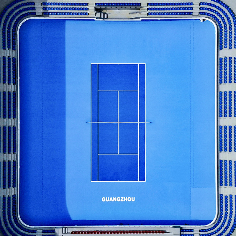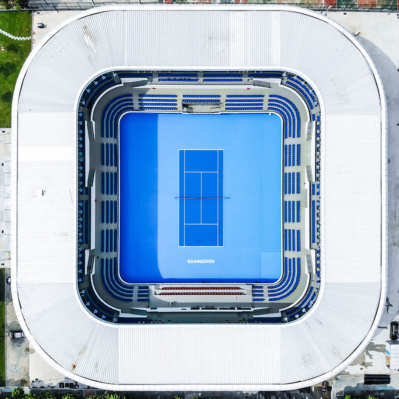廣州網(wǎng)球中心場(chǎng)位于廣州天河體育中心東北側(cè),設(shè)計(jì)秉持“實(shí)用、簡(jiǎn)潔、美觀、大氣”的理念,方中帶圓的流線設(shè)計(jì)盡顯國(guó)際風(fēng)范,蔚藍(lán)色的露天網(wǎng)球場(chǎng)被白色外圍建筑環(huán)繞,空中俯視就像一顆璀璨的藍(lán)寶石,場(chǎng)館周邊綠植采用疏林草地的簡(jiǎn)約設(shè)計(jì),為天河體育中心增添了新的亮色。場(chǎng)館一層采用玻璃幕墻設(shè)計(jì),四周豎向分布的鋼骨架與大面積晶瑩剔透的玻璃幕墻相映襯,不僅使場(chǎng)館外形顯得輕盈、富有動(dòng)感,更打造了較好的隔音、隔熱、穩(wěn)定、安全的空間。
