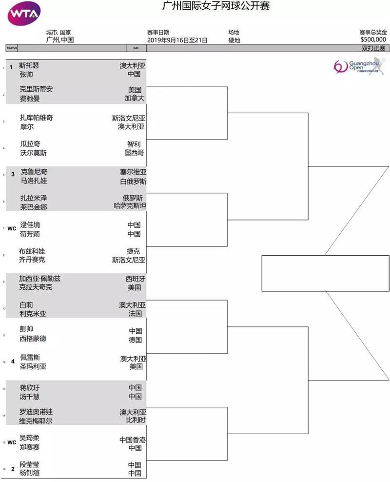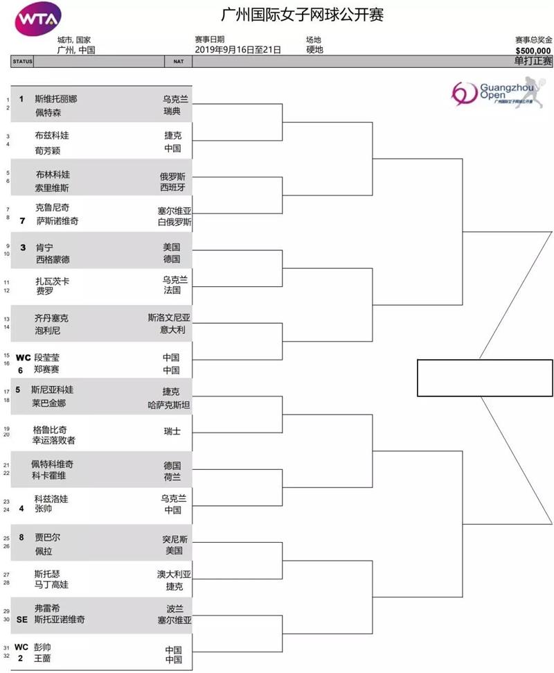 北京時(shí)間9月15日,2019廣州國(guó)際女子網(wǎng)球公開賽正賽單打簽表出爐。賽會(huì)頭號(hào)種子、烏克蘭名將、現(xiàn)世界第三斯維托麗娜和衛(wèi)冕冠軍、中國(guó)金花王薔分列頭兩號(hào)種子,各自鎮(zhèn)守上下半?yún)^(qū),首輪分別面對(duì)瑞典選手彼得森和另外一位中國(guó)金花彭帥。