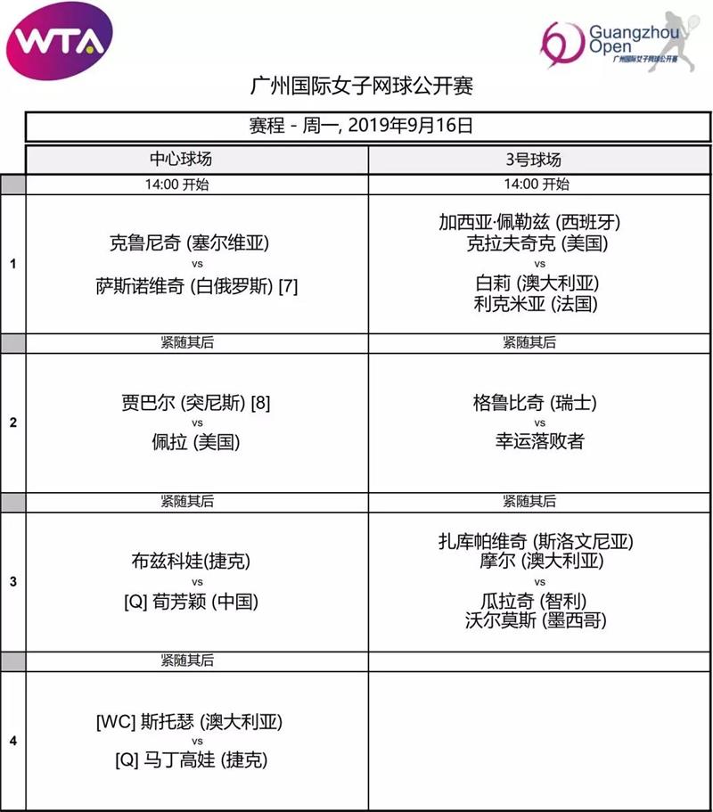 正賽第一日賽程同樣在今天揭曉,7號(hào)種子薩斯諾維奇與2017年賽會(huì)亞軍克魯尼奇之間的強(qiáng)強(qiáng)對(duì)話率先于北京時(shí)間下午2點(diǎn)在中心球場(chǎng)開打。隨后進(jìn)行的是8號(hào)種子、突尼斯名將賈巴爾與美國(guó)球員佩拉的對(duì)決。從資格賽突圍的中國(guó)金花荀芳穎將迎來連續(xù)作戰(zhàn),對(duì)陣捷克小將、2019羅杰斯杯女單四強(qiáng)布茲科娃。壓軸亮相中心場(chǎng)的將是大滿貫單雙打得主、澳洲名將斯托瑟,她將迎來資格賽選手馬丁高娃的考驗(yàn)。