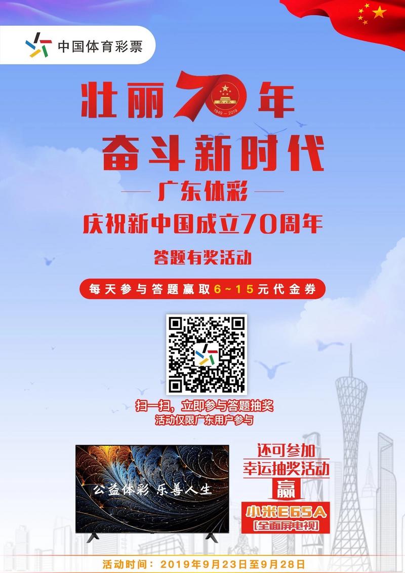 在新中國成立70周年到來之際,廣東體彩開展答題有獎活動,宣傳新中國的歷史、新中國的成就和新時(shí)代賦予的青年使命,高舉主旋律,弘揚(yáng)正能量,積極引導(dǎo)參與者更加熱愛祖國、熱愛黨。