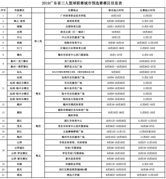 中國體育彩票·2019廣東省3X3籃球聯(lián)賽是一項面向全省草根籃球愛好者的民間草根賽事,具有參與門檻低、包容性強、覆蓋面廣、影響力大的特點,受到廣大百姓的喜愛。自9月全面開啟報名以來,全省各地反響熱烈,報名火爆。截止至10月23日17時,成功報名比賽的隊伍達到720支,其中男子組528支,女子組192支。在賽制方面,本屆比賽分為城市預(yù)選賽、44強分站賽、32強分站賽和總決賽四個階段,其中預(yù)選賽階段在全省22個分賽區(qū)設(shè)立比賽站點。詳見文末附表。