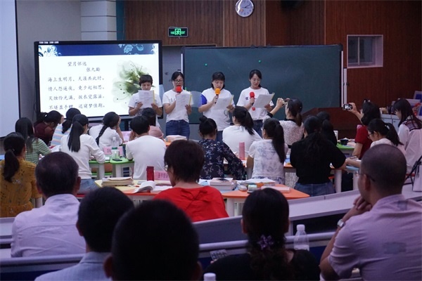下午,培訓(xùn)班的全體學(xué)員在班主任張帆老師的帶領(lǐng)下,來到了廈門市演武第二小學(xué)觀摩語文科組的現(xiàn)場教研活動?;顒臃譃槿齻€環(huán)節(jié),第一個環(huán)節(jié)是“讀”領(lǐng)風(fēng)騷朗讀沙龍活動,五年級組的四位老師將以“月”為意象的8首古詩詞巧妙地串聯(lián)在一起,用動聽的聲音,多樣的形式,帶領(lǐng)大家共同走進詩中的美好意境。第二個環(huán)節(jié)是“閱享時光”——教師專業(yè)“閱讀分享”活動,此次共享閱讀的書籍是《發(fā)展心理學(xué)》,主持人邀請了三位不同風(fēng)格的老師,從不同的角度來分享讀書心得,其見解之獨到,讓人耳目一新。第三個環(huán)節(jié)是語文素養(yǎng)系列——關(guān)于“寫清楚”。低、中、高年級的教師代表給大家進行了教材分析,并介紹了他們的具體做法。整個教研活動嚴(yán)謹(jǐn)有序,內(nèi)容異彩紛呈,學(xué)員們獲益良多。
