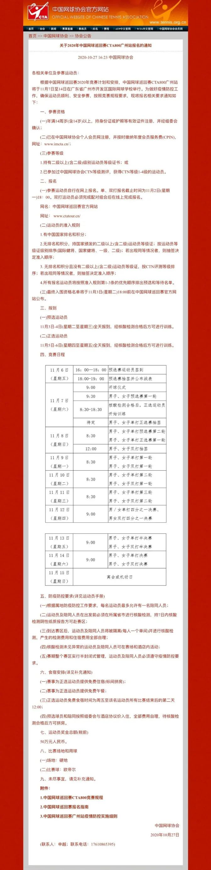 根據(jù)中國網(wǎng)球巡回賽2020年競賽計(jì)劃和安排,中國網(wǎng)球巡回賽CTA800廣州站將于11月7日至14日在廣東省廣州市開發(fā)區(qū)國際網(wǎng)球?qū)W校舉行。單、雙打報名截止時間為11月2日(星期一)18:00。