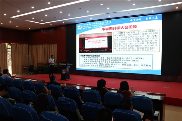 龍衛(wèi)平校長如數(shù)家珍地回顧和總結(jié)了本學(xué)期學(xué)校各項工作取得的主要成果,指出學(xué)校工作呈現(xiàn)以下亮點:突出政治定位,以黨建引領(lǐng)學(xué)校各項事業(yè)改革發(fā)展;多措并舉開展師德師風(fēng)建設(shè),通過開展豐富多彩的黨建教育活動帶動了管理干部隊伍建設(shè);深化教育教學(xué)改革,突出精細(xì)化管理,各項師生比賽成績?nèi)〉猛黄疲龠M(jìn)了學(xué)校內(nèi)涵發(fā)展;深化德育內(nèi)涵建設(shè),扎實推進(jìn)了“啟亮”德育特色品牌工作;進(jìn)一步拓展校企培訓(xùn)合作廣度,做好后勤財務(wù)精細(xì)化管理,促進(jìn)學(xué)校各項工作提質(zhì)增效。