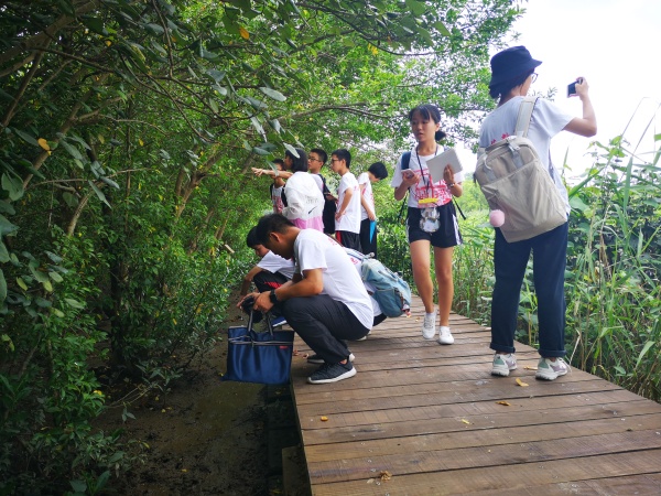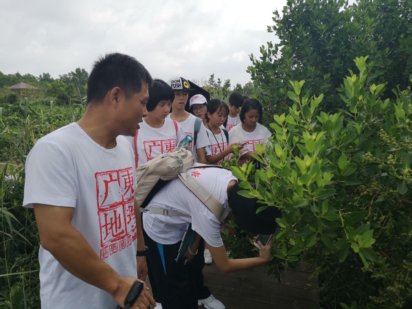 7月14日上午,參賽隊(duì)伍各自領(lǐng)取試題卷,在評(píng)委老師的帶領(lǐng)下乘車前往考察點(diǎn),正式開始研學(xué)考察。第一個(gè)考察點(diǎn)在珠海淇澳島的紅樹林保護(hù)區(qū),參賽選手們認(rèn)真聆聽保護(hù)區(qū)講解員的介紹,實(shí)地觀察灘涂上紅樹林胎生、泌鹽以及板狀根和呼吸根等獨(dú)有特征,積極尋找自己最喜歡的代表性紅樹科植物,感受物種多樣、生物資源高度豐富的紅樹林生態(tài)系統(tǒng),思考紅樹林淤積成陸的過程。