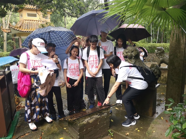 午后,參賽隊(duì)伍乘車前往第三考察點(diǎn)唐家灣古鎮(zhèn)。抵達(dá)共樂園不久,天公不作美,下起了傾盆大雨。參賽選手和指導(dǎo)教師們不畏所擾,靜坐聽雨。待暴雨初歇,緊張的研學(xué)調(diào)查又即刻高效率展開。選手們走進(jìn)清末民初政界名人唐紹儀曾經(jīng)的私家花園,感悟德風(fēng)氣之先的唐家灣人,如何成長(zhǎng)為歷史轉(zhuǎn)型期中一位位風(fēng)云一時(shí)的杰出人物。最后,參賽隊(duì)伍走進(jìn)“唐家三廟”,領(lǐng)略唐家灣人的處事心態(tài)和家國(guó)情懷。