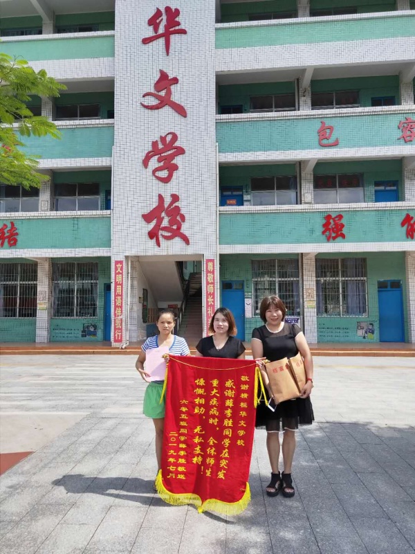 學(xué)校得知這事后,立刻向全校師生發(fā)出了愛(ài)心捐款倡議并在期末散學(xué)典禮上舉行愛(ài)心捐款活動(dòng)?;顒?dòng)得到了全校師生的積極響應(yīng),學(xué)校行政班子成員帶頭捐,其他師生緊隨其后,大家紛紛伸出關(guān)愛(ài)之手。涓涓之水,匯出愛(ài)的暖流。此次愛(ài)心捐款共為患病學(xué)生籌得了46800元,緩解了該生家庭的燃眉之急。學(xué)校師生的善舉也感動(dòng)了該學(xué)生及其家長(zhǎng),7月28日上午,該生媽媽親手寫(xiě)了一份感謝信送到華文學(xué)校,同時(shí)向?qū)W校贈(zèng)送了一面錦旗以表達(dá)全家人的感激之情。