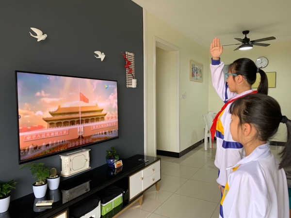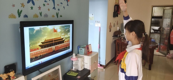 按照學校的傳統(tǒng),每周一會舉行全校集會,舉行升旗儀式。因為延遲開學,南朗小學以“空中課堂”的方式進行周一的升旗儀式和主題班隊會活動,全校師生在家通過網(wǎng)絡的方式,通過電腦、手機等終端進行線上觀看,在線上參與。